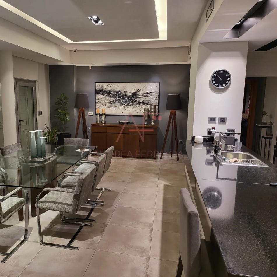 Desarrollada en una planta, cuenta con un Hall-Living recibidor, un living intimo con salida a la galeria y al parque, cocina comedor integrados, 2 habitaciones en suite, escritorio con baño completo (podria ser dormitorio de huéspedes), otro escritorio en distribuidor de las habitaciones, galeria cubierta con parrilla, cochera para dos autos, parque con piscina